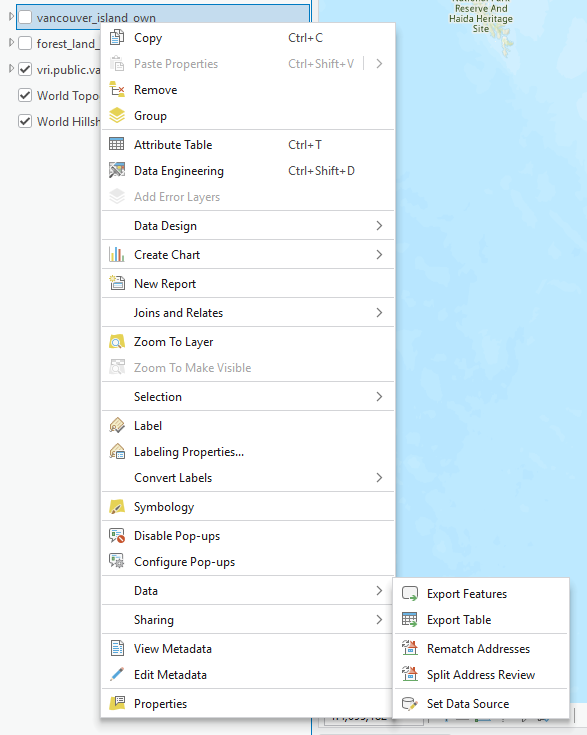 Step 8: Export the selection you have made your ArcGIS Pro project geodatabase by right-clicking the “vancouver_island_vri_select” layer in your Table of Contents, select “Data”, then select “Export Features”. In the dialogue window that opens, change the output filename to “forest_land_base” (Note: layers stored in geodatabases do not have file extensions), the default location is already the geodatabase for your ArcGIS Pro project. Click “Ok”. This should take about 5 minutes to complete.