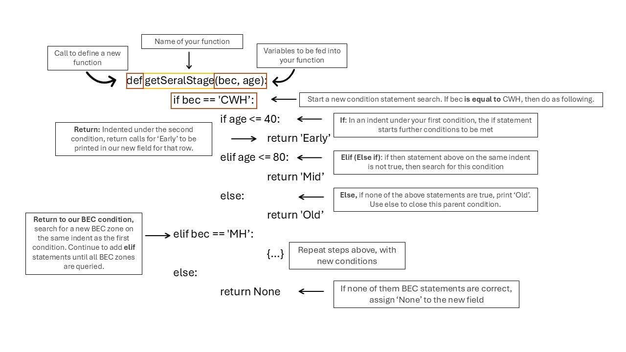 In the expression field paste the following code. This take the BEC zone code and estimated age as inputs into a function that we will define.