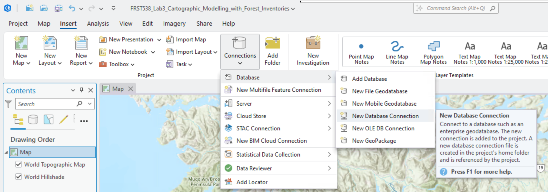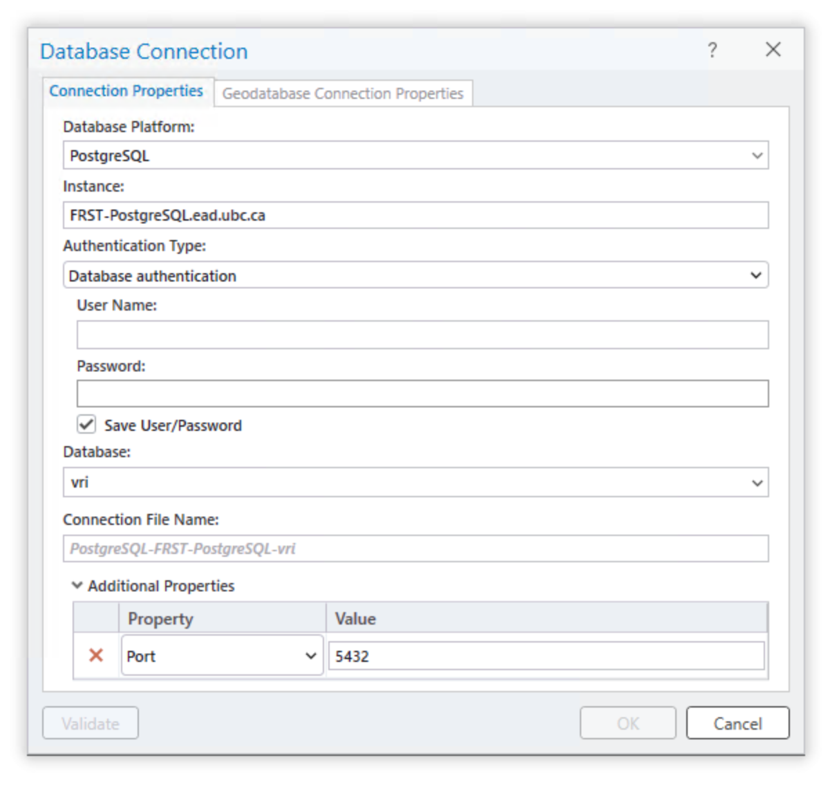 You can name it “UBC PostgreSQL Server” and for the host enter “FRST-PostgreSQL.ead.ubc.ca”. The username and password will be provided to students enrolled in the course. Once you have correctly entered the correct credentials, ArcGIS Pro will do a “soft” connection to the server to retrieve the available databases. From the “Database” drop-down menu, select “vri” and then click “OK”.