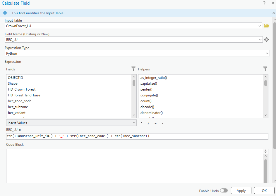 The str() function ensures that the attribute values are treated as text strings rather than numeric values for addition. The result should be a new string of landscape unit, BEC zone and subzone.