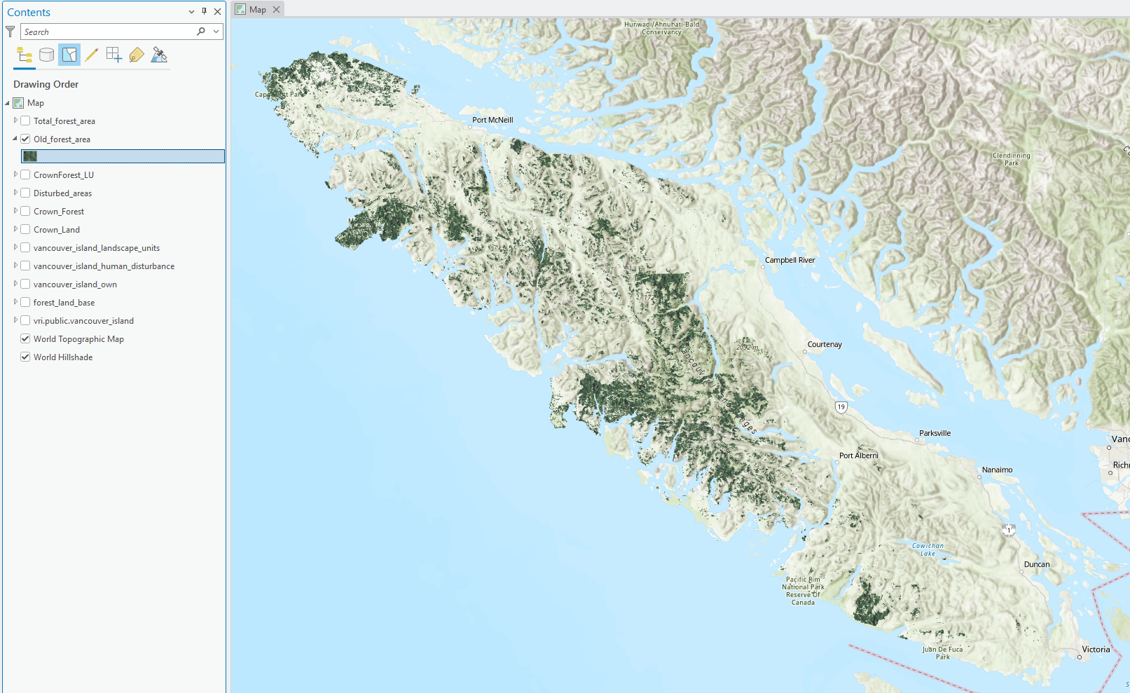 Repeat the last step for “vancouver_island_human_disturbance” and “vancouver_island_landscape_units”. Altogether, this is about 600 MB of data, so be sure you have sufficient disk space and be patient as the data transfer completes. When finished, you can drag the layers into ArcGIS Pro to visualize them on the map. If you paused drawing mode earlier, then unpause it now.