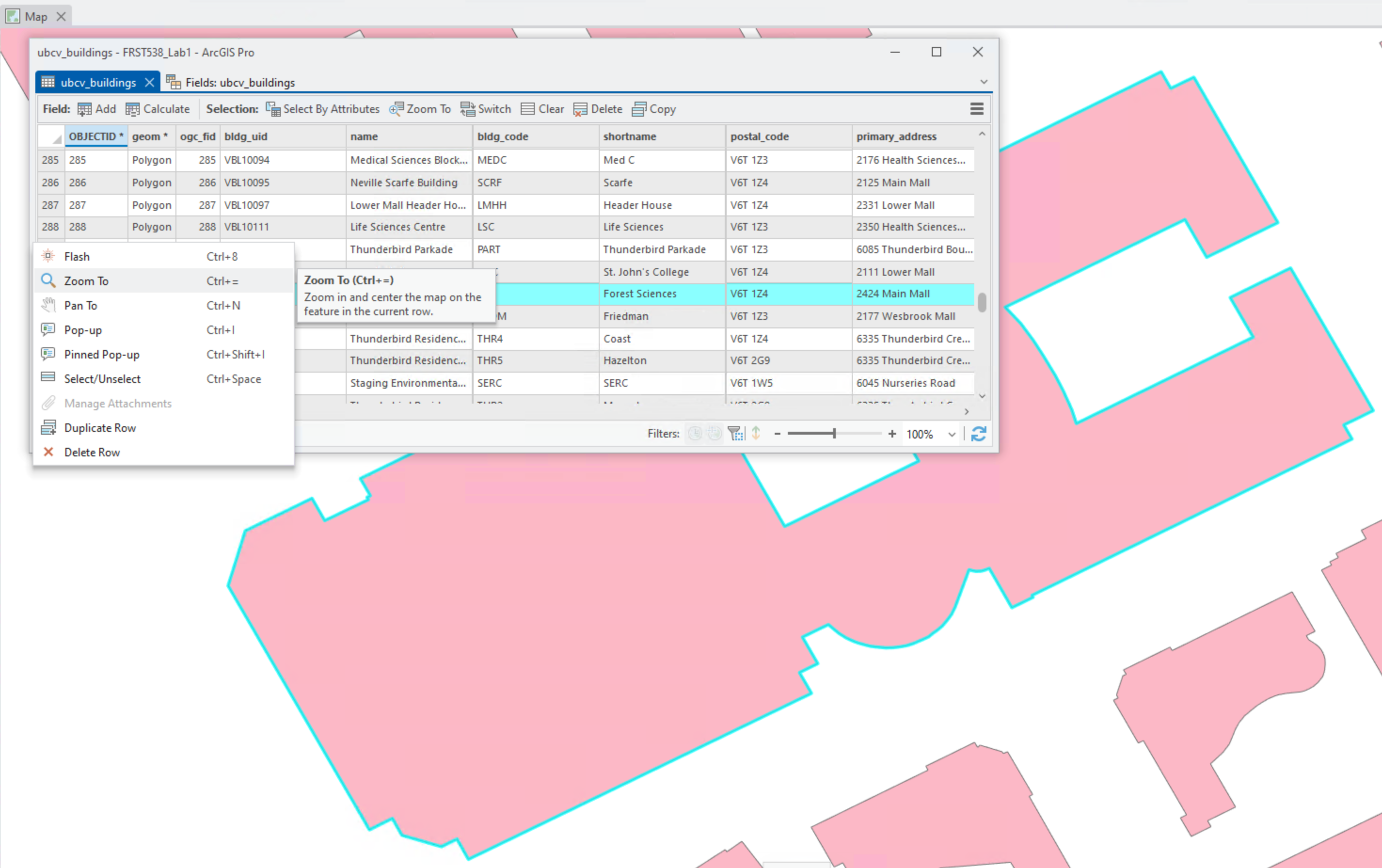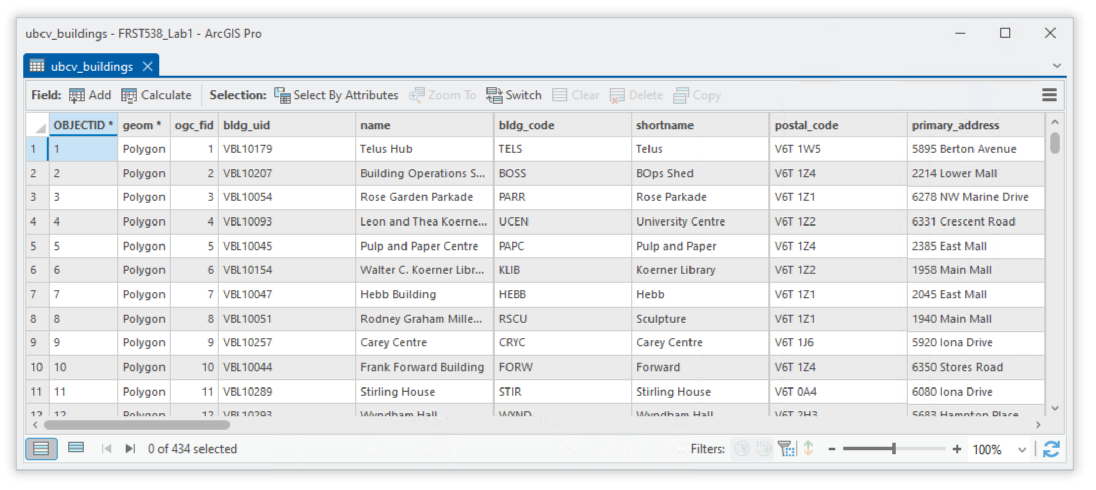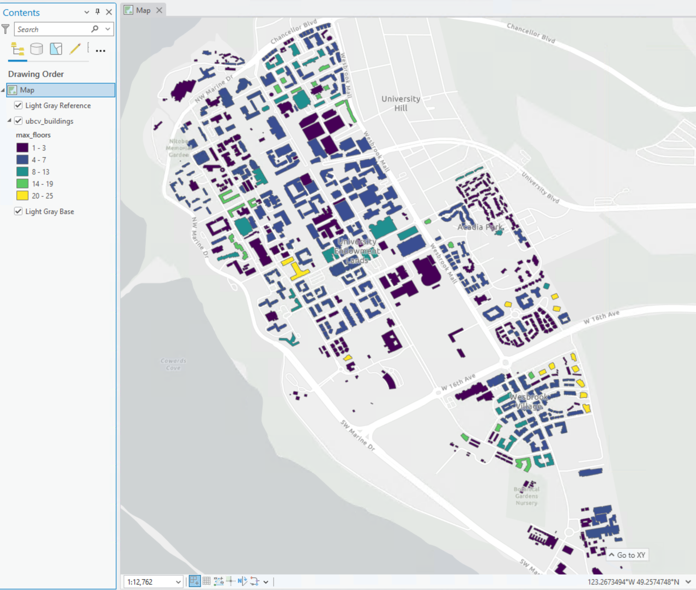 The extent represents the extreme spatial limits of the dataset, as if you drew a rectangle around all the features, what we call a bounding box. In the image above, the units of the extent for the buildings on UBC Vancouver campus are given in decimal degrees (“deg”). Below that, we see the CRS for these data is WGS 1984, a geographic coordinate system. In other words, these data are mapped purely in latitude/longitude values and are not projected. Remember that the CRS of our data can be different than the CRS of our ArcGIS Pro Map.