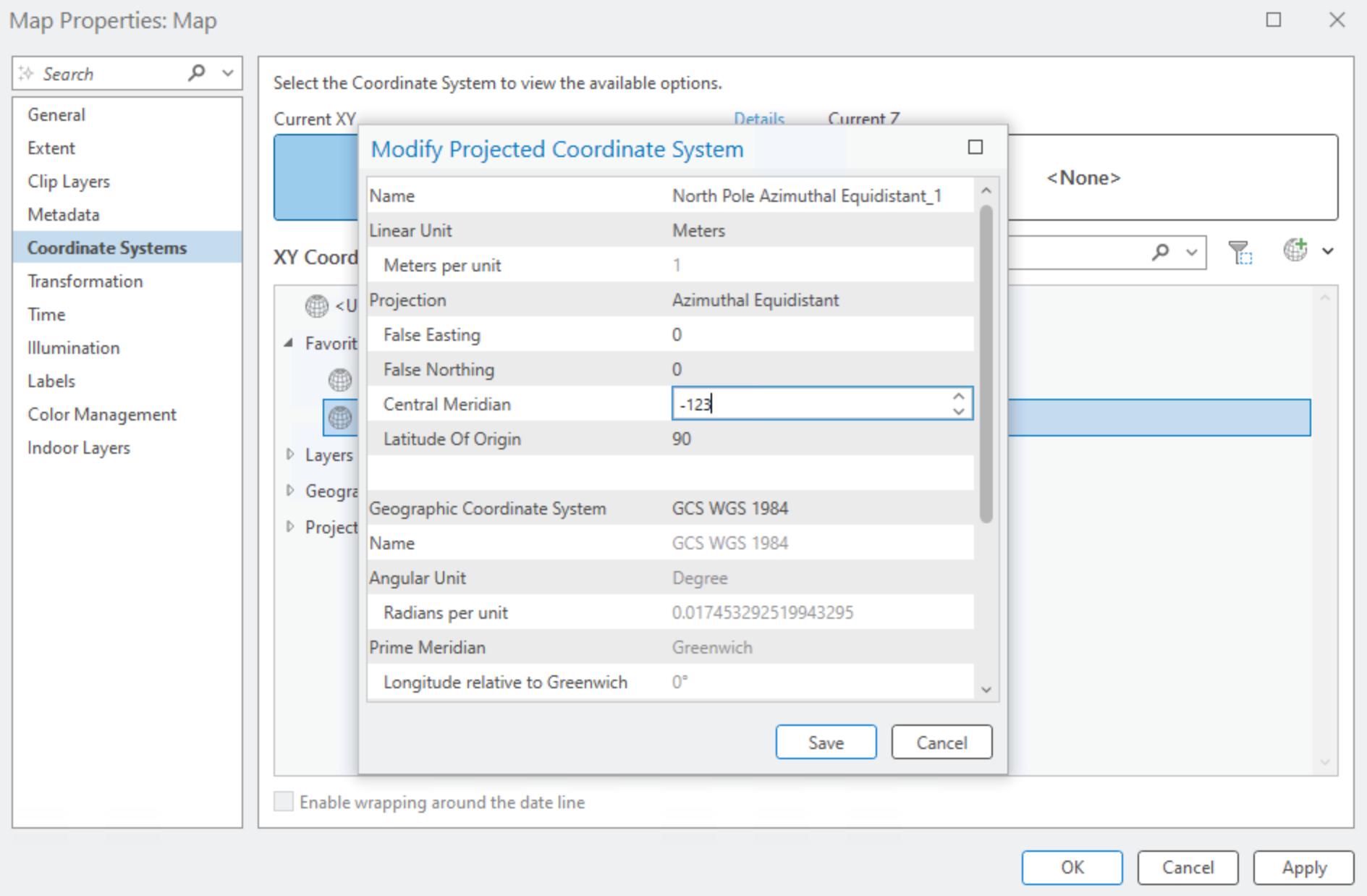 Step 4: Select or search for “North Pole Azimuthal Equidistant” and double-click it or select it and click “Apply”. Inspect the result. We can also modify CRS definitions to create a custom map projection. For example, notice how Canada is rotated in this azimuthal projection because the default central meridian is 0° longitude. Open the map properties again, but this time right-click on “North Pole Azimuthal Equidistant” and select “Copy and Modify”. In the dialogue window that appears, find the value for “Central Meridian” and change it from 0 to -123, then click “Save”, then click “Apply”. Inspect the result. Notice that we have now rotated the map projection over Vancouver, Canada. Feel free to explore other projections, if you want, but before proceeding to the following steps, be sure to change your map CRS back to “WGS 1984 Web Mercator (auxillary sphere)”.