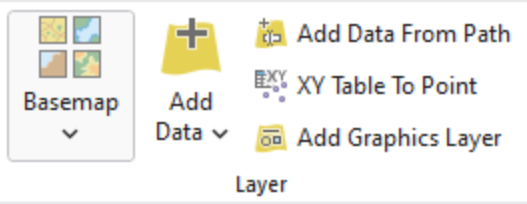 The “Layer” group allows you to change the basemap and add spatial data as layers from various sources. An important concept to understand in GIS is the distinction between “layer” and “data”. “Layers” are exactly that, they are what we see in the map. We can change the colours and symbology of layers in ArcGIS Pro, and these visual choices are stored as part of the .aprx project file. When you add spatial data to your map, they appear as “layers” in the “Contents Pane”. On the other hand, “data” are the spatial data files that are being read from your project folder or some other source. When you change the symbology of a layer, we are not editing or changing the data in any way. Even if remove the layer from your map, you are not deleting the data file, rather you are removing the reference to that file from your project that is used to display the layer.