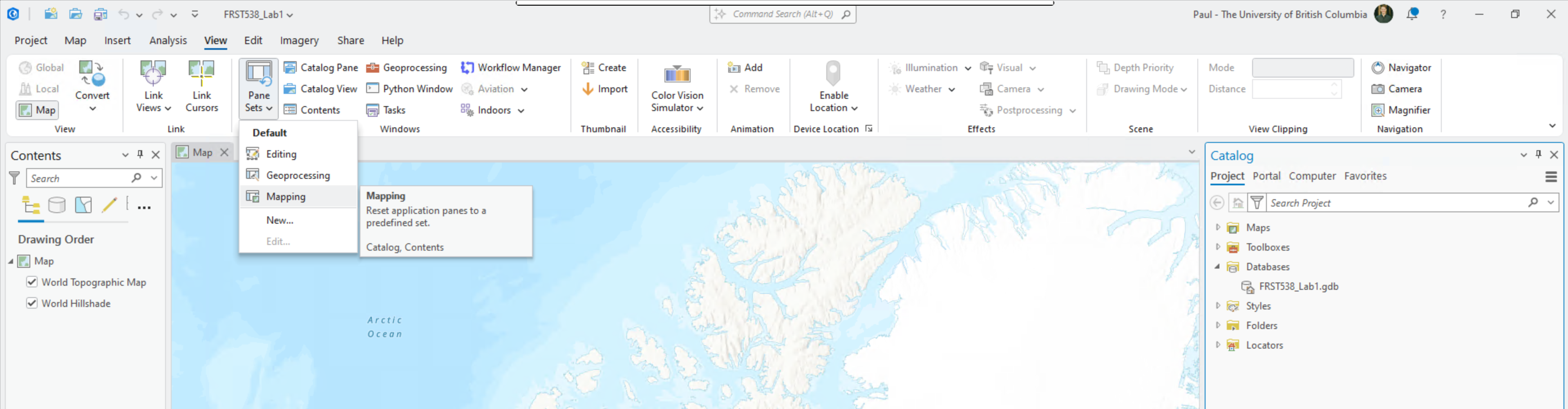 If you do not see the “Contents” and/or “Catalog” panes, then navigate to the “View” tab from the top ribbon, “Set Panes”, then select “Mapping” to return to the default configuration.