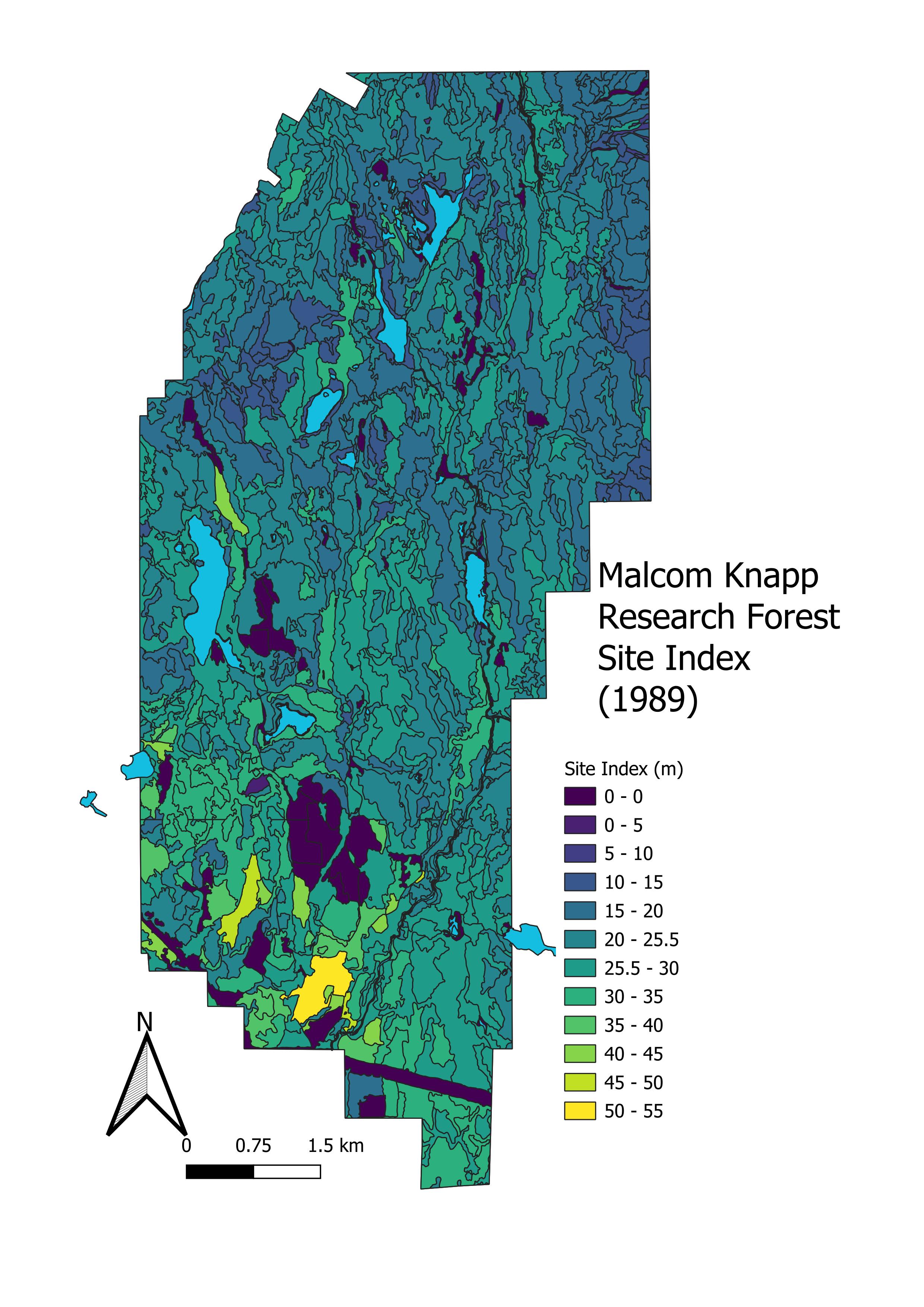 Site index is a measure of productivity. It is technically defined as: expected height (m) of the best trees (not damaged, biggest) of the dominant species at a reference age of 50 years breast height age. The site index reflects the potential of the site to grow this dominant species. Although this might also indicate how another species might do, this does not give a measure of the possible productivity of another species. For example, a site that is Douglas-fir leading and has a high site index would not indicate that a species like Whitebark pine (a high alpine species) would also do well. Also, if the soils change (e.g., landslides, fertilization, etc.) or the climate/hydrology changes, the site index might not be a good an indicator of the productivity for the historically dominant species. Importantly, for site index to be reported there have to be trees in the stand. In the MKRF dataset some recently harvested stands may show a “0” for site index, but this is really an NA.