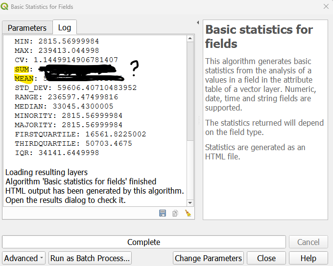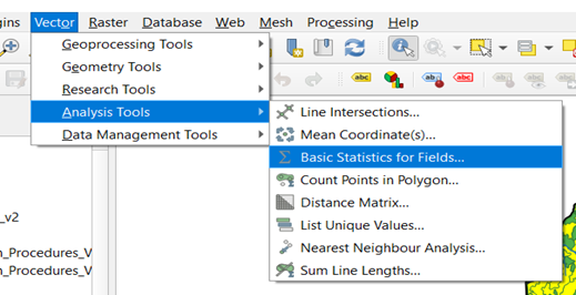 1. Click on the vector icon in the top menu and go to Analysis Tools -> Basic Statistics for Fields.