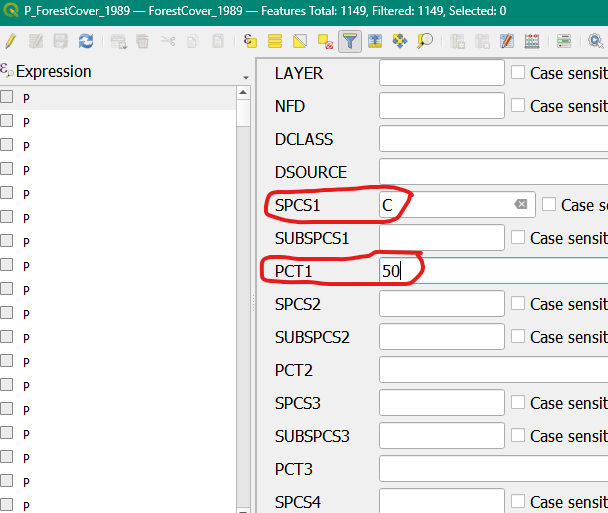3. Click the to return to the tabular format. You can see that we have now selected have a SPCS1 (leading species) of “C” for cedar, and that these polygons are >= 50%. Use this to answer question 5.
