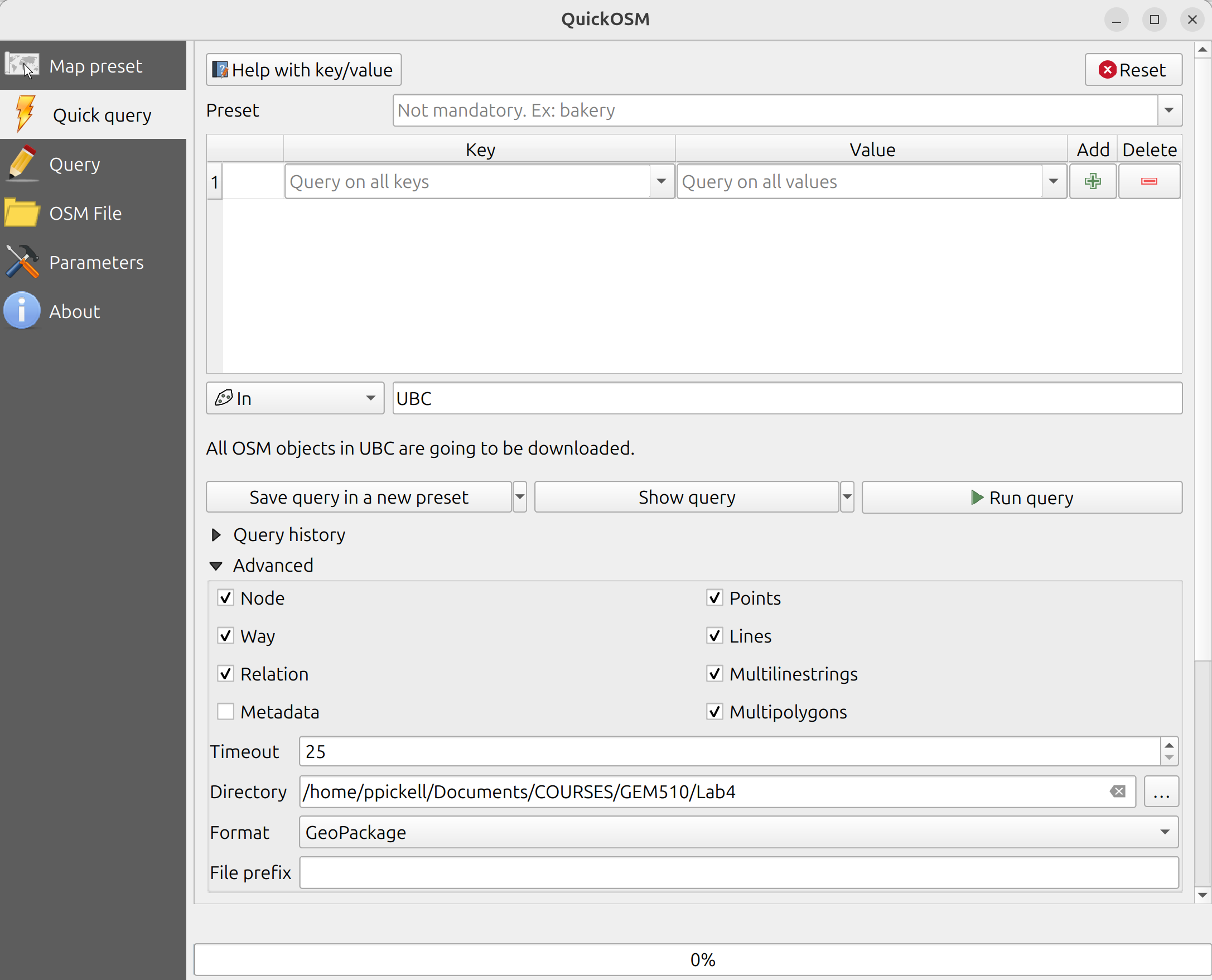 Step 6: When the QuickOSM dialogue window opens, select “Quick Query” from the left navigation panel. Find the field where it says “A village, a town…” and type “UBC” in the field, leave it set to “In”. Note that you can also apply filters to subset the OSM data based on key-value pairs, but for this lab, we are going to grab all of the data for UBC so make sure the filters at the top are empty. Expand the “Advanced” option at the bottom and ensure that “Node”, “Way”, “Relation”, “Points”, “Lines”, “Multilinestrings”, and “Multipolygons” are all toggled on. Finally, in the “Directory” field, navigate to your QGIS project location or folder you are using for the lab and select “Geopackage” from the drop down menu. You do not need to specify an output filename. Run the query.