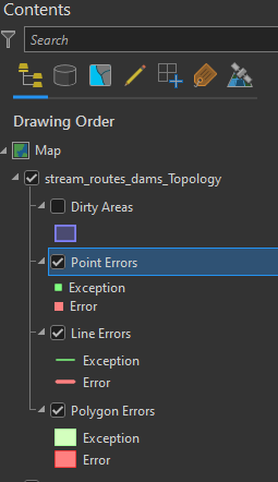 Step 8: You can click and drag the topology into the map to view any errors. We expect there to be errors because we know that the dams should intersect with our stream routes. You should see red squares all over the island. In the Contents Pane, right-click the “Point Errors” layer, select “Data”, and select “Export Features”. Save the points to your feature dataset as “stream_dam_junctions”.