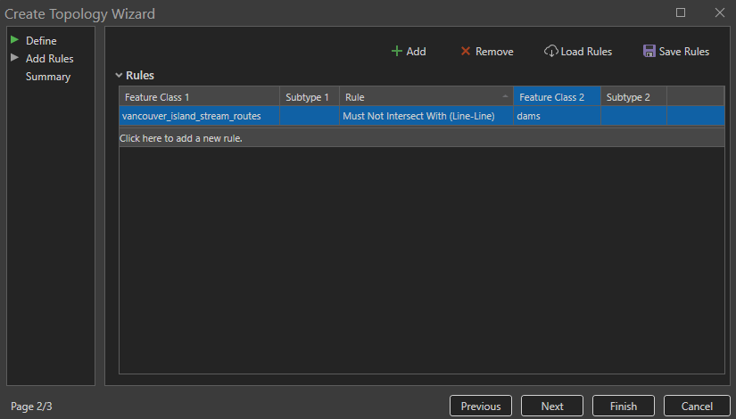 Step 6: On the second page of the wizard, add a new rule so that the stream polylines must not intersect with the dam polylines.