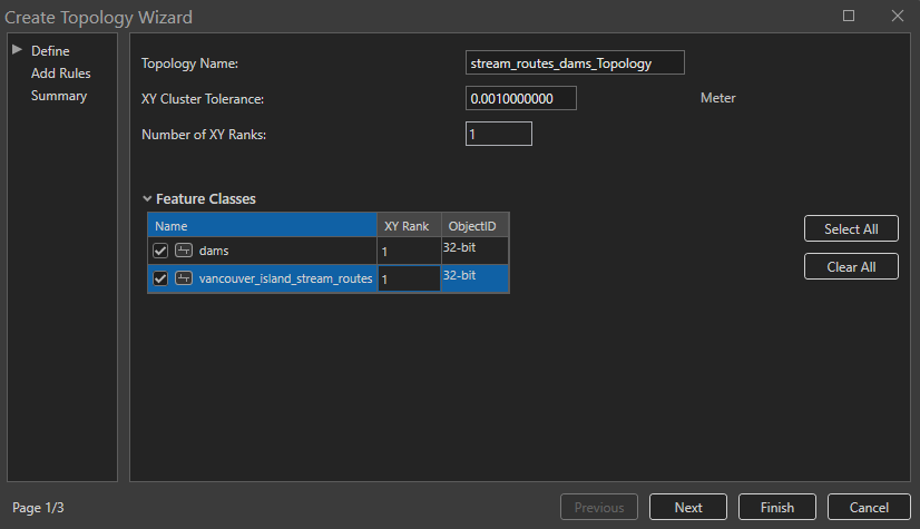 Step 5: On the first page of the wizard, toggle on the dams and stream routes feature classes.