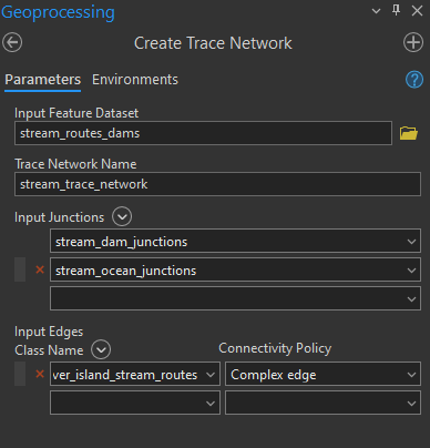 Input Junctions should contain both the “stream_dams_junction” and “stream_ocean_junctions” from the Topology geodatabase.