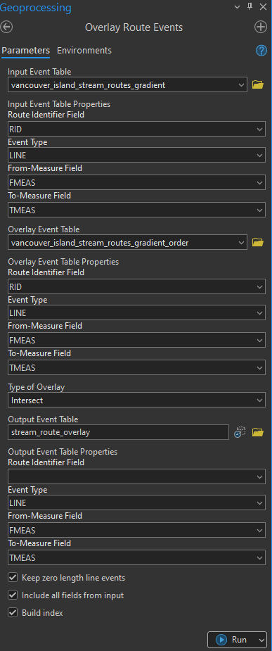 Now you will practice doing an overlay with your route event tables to transfer all the attributes into a common linear referencing system. This will allow you to then query the network for stream segments that meet some basic conditions for salmon habitat.