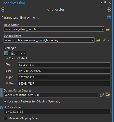 Step 2: Go back to ArcGIS Pro, and make sure you are connected to the salmon database on the UBC PostgreSQL server and locate the salmon.public.vancouver_island_boundary layer. Once you find it, add it to your project. Also, add the Vancouver Island DEM (the one you just exported from QGIS) to your map project. Then, clip the DEM using salmon.public.vancouver_island_boundary with the Clip Raster tool, and make sure to toggle on “Use input features for clipping geometry.”
