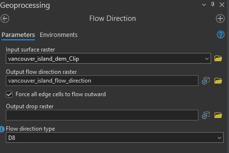 Calculate the flow direction of the DEM, using the “Flow Direction” tool. The flow direction tool determines which raster cells flow into other cells based on the elevation difference the immediate neighborhood. Keep the defaults of the tool. Ensure that “Force all edge cells to flow outward” is toggled on and leave all other parameters with the default value. Save the output as vancouver_island_flow_direction. The cell values in the output raster represent the steepest down slope direction of each pixel.