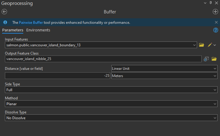 Step 9: Take the Vancouver Island boundary polygon provided and perform a negative buffer, called a nibble. Open the Buffet tool, and use -25 meters for the buffer distance. We are doing a negative buffer because we want to ensure that this edge intersects with the streams that terminate at the ocean. Remember that the streams were generated by an imperfect and imprecise DEM, therefore this process will ensure that every stream that reaches the ocean will intersect this boundary.
