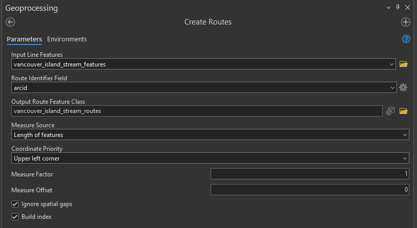 Step 2: Convert your stream features into routes using the “Create routes” tool. Use you Stream Features output as the Input Line. Set the Route ID field to “arcid”. The coordinate Priority parameter can be set to any corner. When you go to save your output, navigate into your feature dataset (it “feels” like entering another folder from the Catalog view), and save the output as “vancouver_island_stream_routes”.