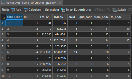 grid_code in the event table represents the classified stream gradient (0 is ≥20%, 1 is <20%). Note that you have more records in this table than you have routes, because many routes are being segmented based on the gradient. Thus, you see repeating route id”s (RID).
