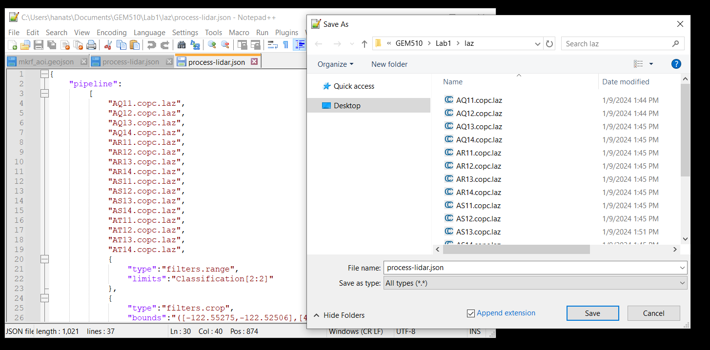 Step 8: Copy the contents of the pipeline to a text editor and save the file as “process-lidar.json” in your QGIS project folder. It should be in the same place as the .laz tiles you just downloaded. The output will also be written to this folder.