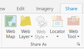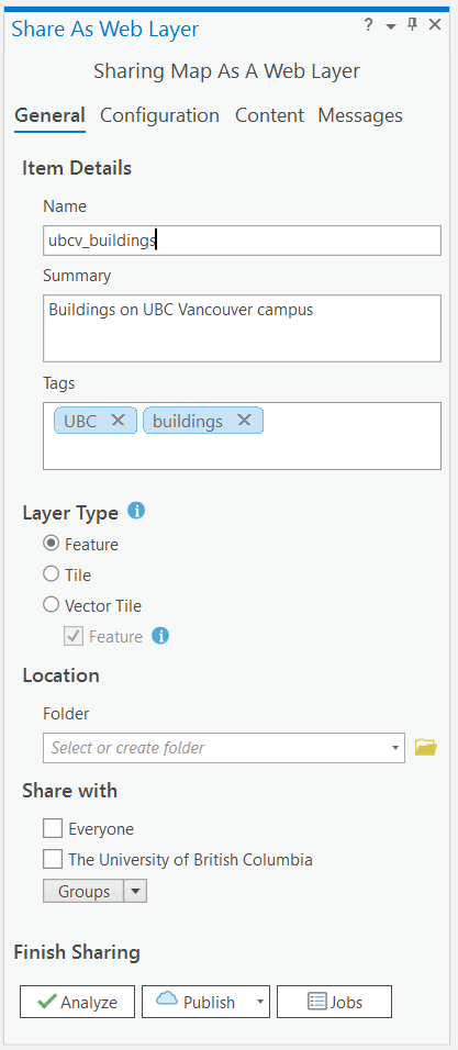 Step 2: Under the Share tab on the top ribbon, you will see two options: “Web Map” and “Web Layer”. Select “Web Layer” and “Publish Web Layer” under the Share tab. The default name will be the name of your map, but give the layer a meaningful name, add a few words of summary, and add some relevant tags. Select “Feature” as your “Layer Type”, then click “Analyze”. If you do not get any warnings, then click “Publish”. You must be connected to the internet in order to publish the content to your ArcGIS Online profile.