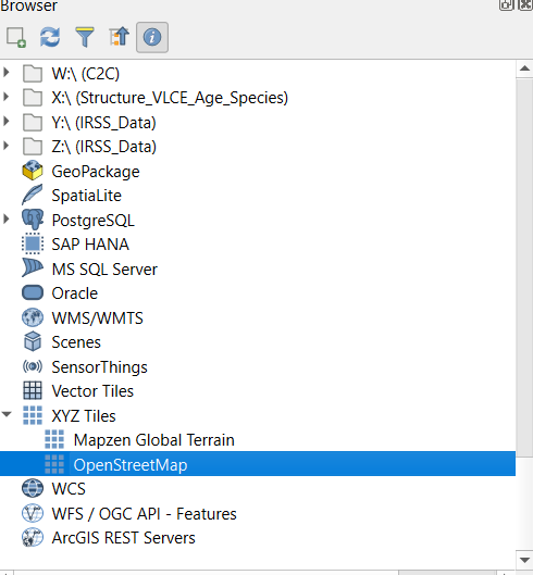 Step 2: Add a basemap by scrolling through the Browser panel and double clicking on Open Street Map. You may get a pop-up window asking which geographic transformation you want to apply to the basemap. Click the first one on the list > Okay. In the Layers panel you can change the order the layers plot in by dragging and re-ordering them. Put the basemap on the bottom and the herd layer on top. Practice zooming in and out and panning on the map.