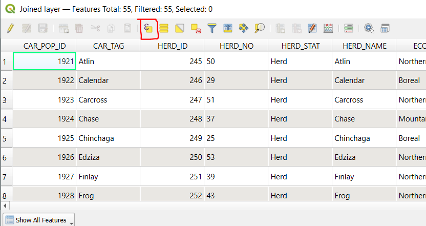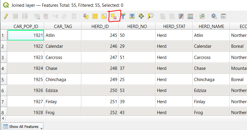 Load the Herds.fgb and the Herd_area_forest.csv datasets. The “flatgeobuf” or fgb is a new spatial data file type, it is equivalent to a shapefile that we worked with in ArcGIS, but it is open-access and is not “owned” by ESRI (the company the makes ArcGIS). Also note that the Herd_area_forest dataset is not a spatial data set (it is just a table of attributes) - so it will not add spatial data on the map.