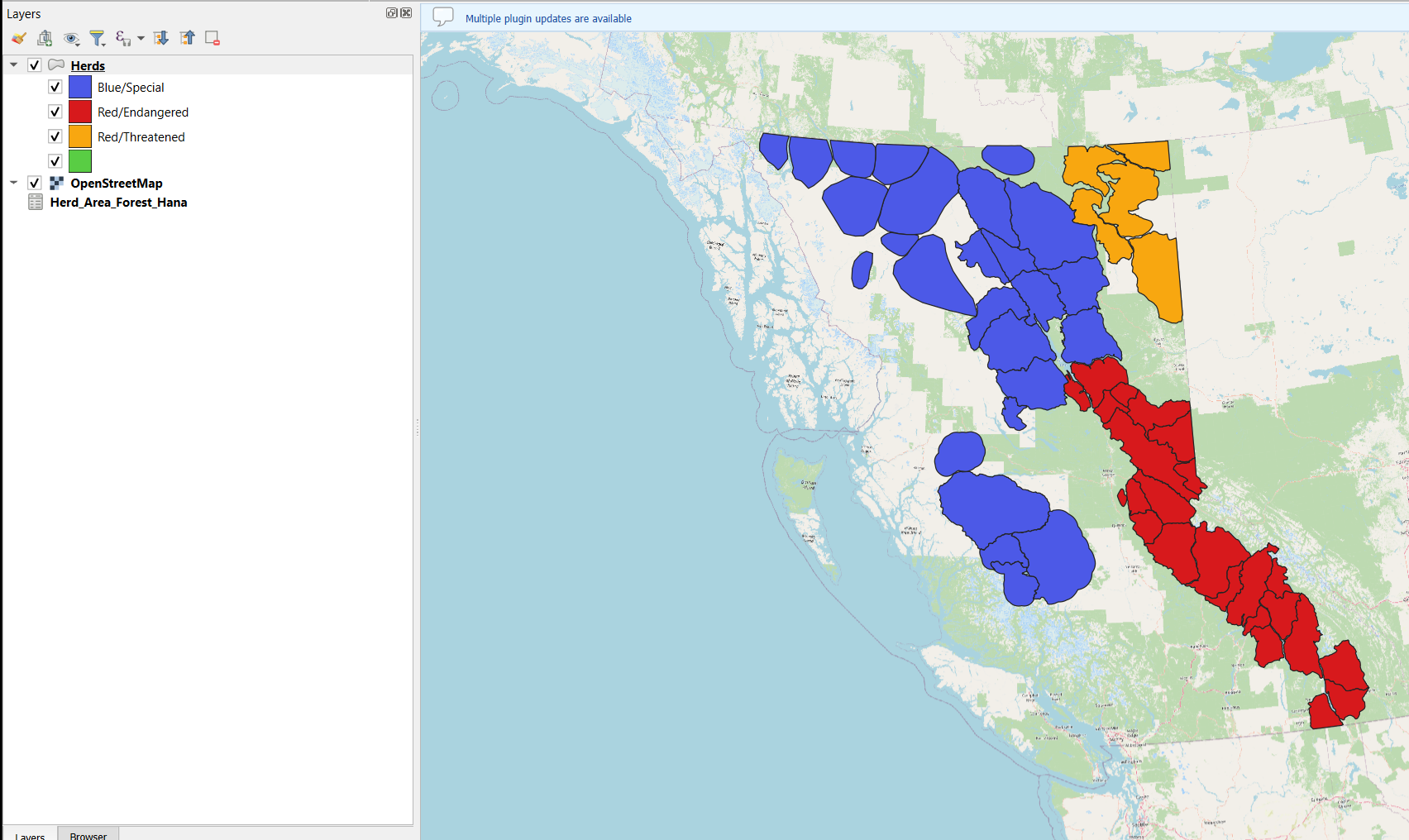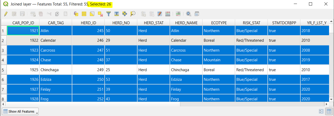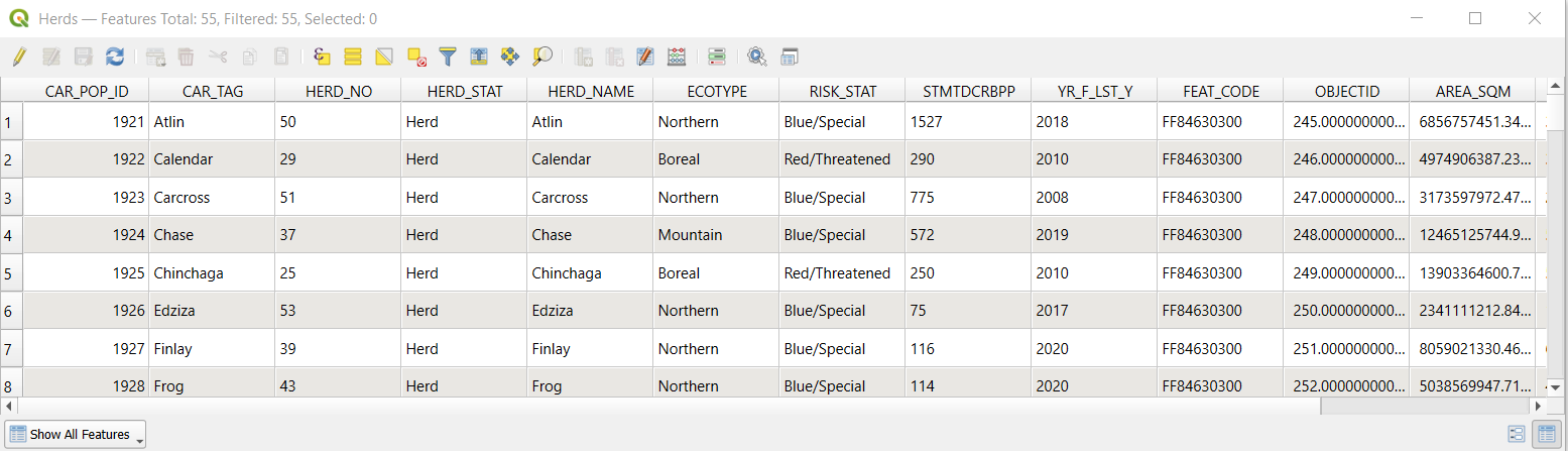 Step 3: Open the Herds attribute table by right-clicking on it in the Layers panel > Open Attribute Table. Each polygon in this layer represents the range of a caribou herd. You can see attributes for things like the herd name, ecotype and risk status.