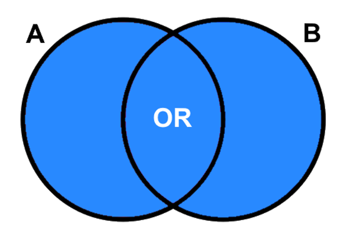 OR is an inclusive statement that will select all the features that meet any one of the criteria. As outlined in the shaded blue tuple, all the features that fall within this area will be selected (A OR B).