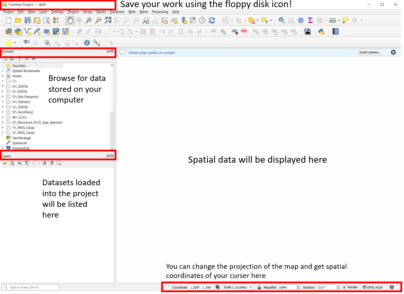 Step 1: Open QGIS and select “New Empty Project”. To add data to the map use the Browser pane on the left to navigate to the directory on your computer where the lab data is saved. Your “Downloads” and “Documents” folders will be listed under the Home directory in the Browser. Double click on a layer to add it to the map.