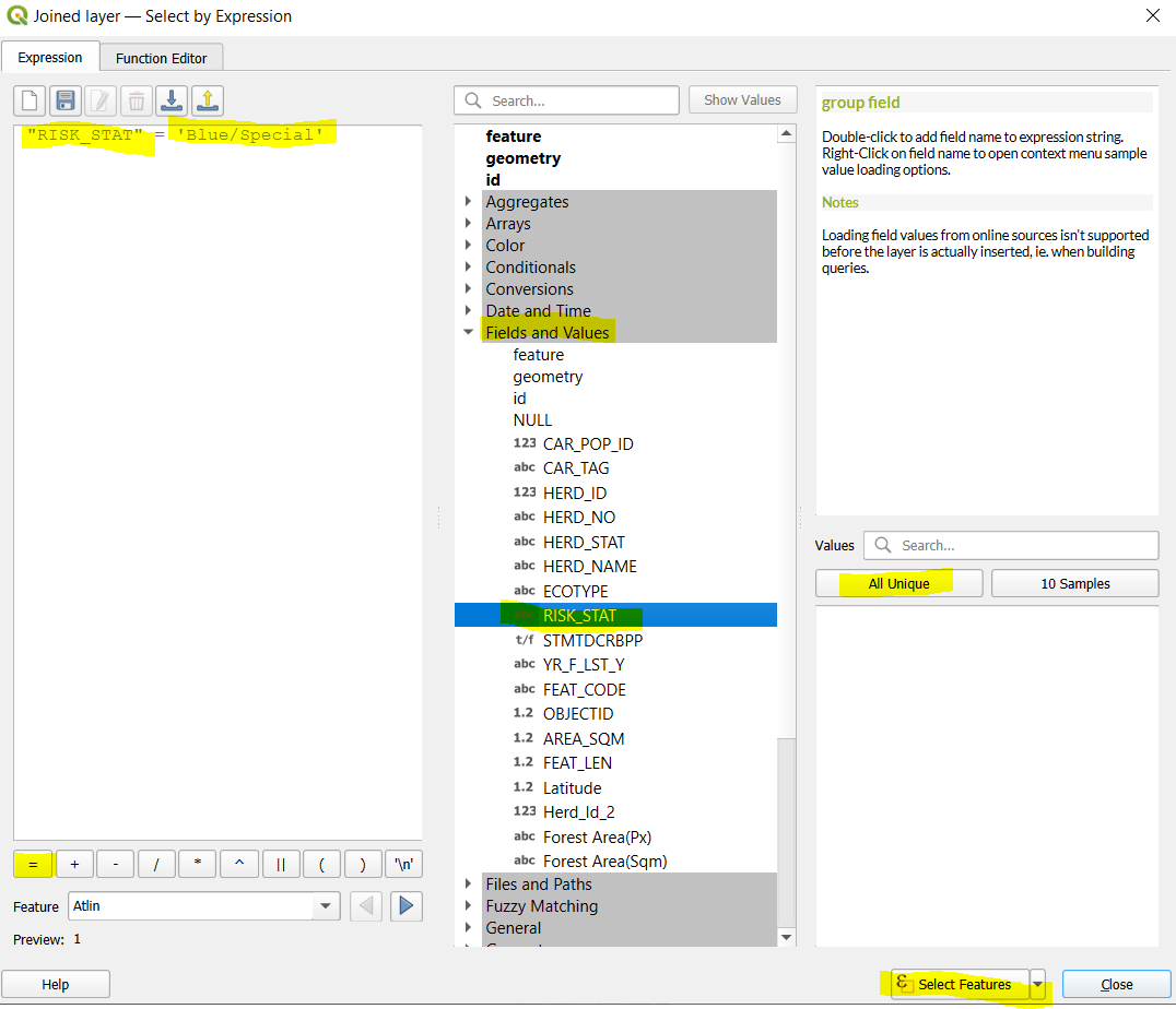 Step 2: First, we will select the features where the RISK_STAT attribute is ‘Blue/Special’. Expand the “Fields and Values” menu. Double click the RISK_STAT attribute - this will add it to the expression box on the left. Use the = sign button on the bottom (or type in in) to add the symbol to the expression. Finally, click the “All Unique” button to see the unique values of the RISK_STAT attribute and click Blue/Special. You should now see the completed expression on the left. > Select Features. The selected features should be highlighted in yellow on the map.