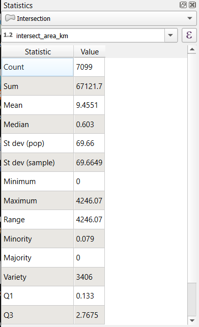 Change the input layer to “Intersection” and the attribute to “intersect_area_km”. You should now see summary statistics of the “intersect_area_km” field for all polygons in the dataset.