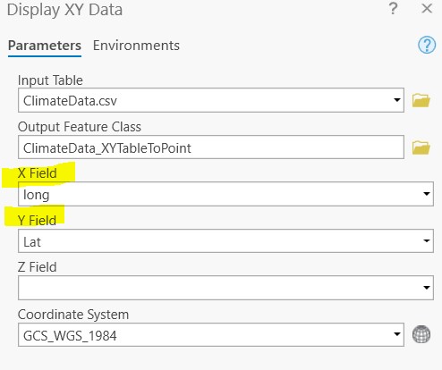 Step 3: Next, we will add data to the map using the lat/long coordinates from the csv. Right click on ClimateData.csv in the Contents pane then select Display XY Data from the dropdown menu. Ensure that the X Field shows the column corresponding to longitude (long) and the Y Field shows the column corresponding to latitude (lat). Leave the output feature class coordinate system as the default. Click OK.
