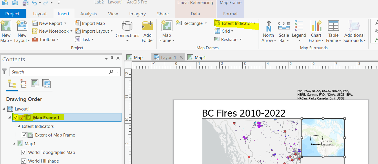 Click on Map Frame 1 then in the top ribbon select Extent Indicator > Map Frame (this is the BC fire map.) This will add a box on the inset map showing the extent of the BC fires data.