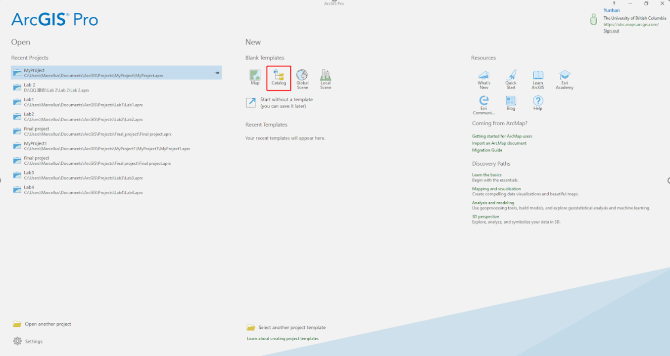 Step 1: Start ArcGIS Pro. Under the New header, select Catalog. Name the project “Lab2”. When ArcGIS Pro opens a new Catalog window, navigate to your Lab2 folder.