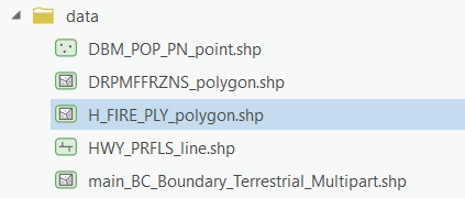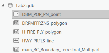 Step 3: Open the Catalog pane by clicking View > Catalog Pane. Under the folders tab you should see the folder with your lab 2 project. You have six shapefiles in the data folder. Three different kinds of icons are shown in front of shapefile names. These indicate what type of data (point, line, or polygon) is stored within a shapefile. For example, the DBM_POP_PN_points shapefile is composed of points, the HWY_PRFLS_line shapefile is composed of lines, and the main_BC_Boundary_terrestrial_multipart shapefile is a polygon.