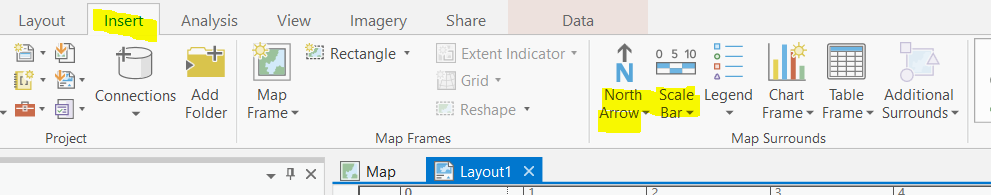 First, add a scale bar and north arrow in the Insert tab (top ribbon). Use the drop down arrows to select a style, you can also customize the map elements by right clicking on them in the Contents pane > Properties.