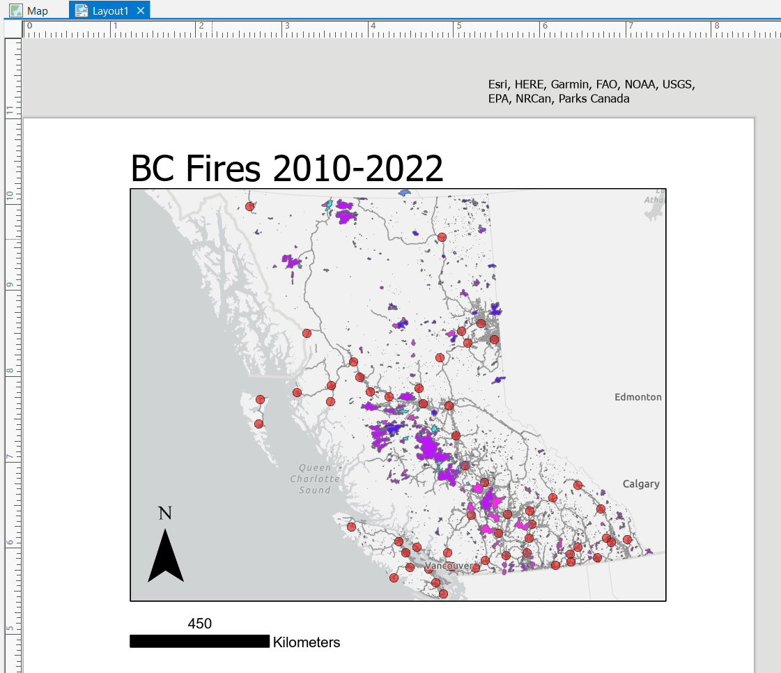Once the map extent is drawn, you can zoom in/out and reposition the map within the map frame by right clicking on Map Frame in the Contents pane > Activate. Adjust the Map Frame so that you can see the extent of BC. When you are done click the back arrow to go back to the layout.