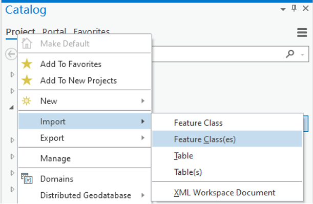 Step 6: Right-click the lab2.gdb in Catalog, select import, then select Feature Class(es). Click the folder button and navigate to the Lab 2 data folder and select each layer, then click “Run”.