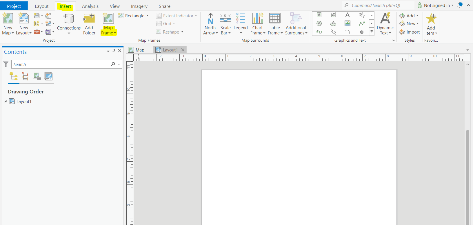 In the new Layout, select Insert > Map Frame. Select Map1, then drag and draw where the data will be displayed on the page. Leave room on the sides for latitude/longitude labels.