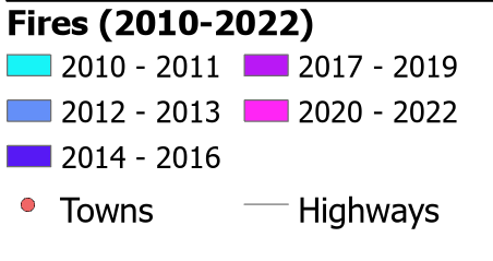 Change the symbology of the historical fires polygon so that fires are color coded by the FIRE_YEAR attribute. Choose an appropriate color scheme to show which fires are most recent. You may also change the symbology of the highwats and cities layers.