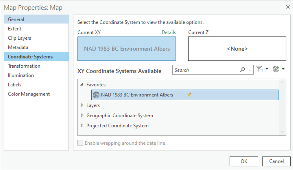 Step 4: Open a new Map. Under the Insert tab on the top ribbon, click New Map. Before adding any layer, you need to make sure that the coordinate system of the map gives an accurate projection of your study area. For this lab we will focus on BC, so we will use the coordinate system that best reproduces BC. In the Map interface, right-click “Map” in the contents, select properties, and in the pop-up window, select Coordinate Systems. Change the coordinate system to “NAD 1983 BC Environment Albers”.