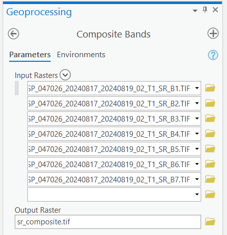 Step 2: Search for the “Compsite Bands” tool in ArcGIS Pro. Add all of the seven surface reflectance bands and then name the output “sr_composite.tif” and save it in your ArcGIS Pro project folder.