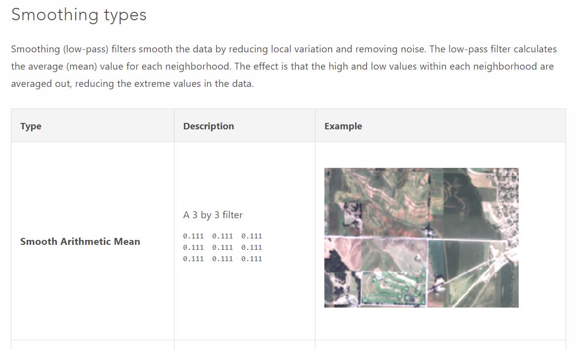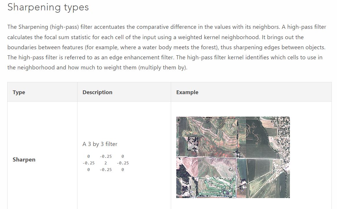 More advanced filters use weighted functions, where the pixels in the window are multiplied by a weighting factor that makes them more or less influential in calculating the target value. Shapening and Smoothing filters use weighted means to enhance or smooth the edges of features in an image. For more information see: https://desktop.arcgis.com/en/arcmap/latest/manage-data/raster-and-images/convolution-function.htm
