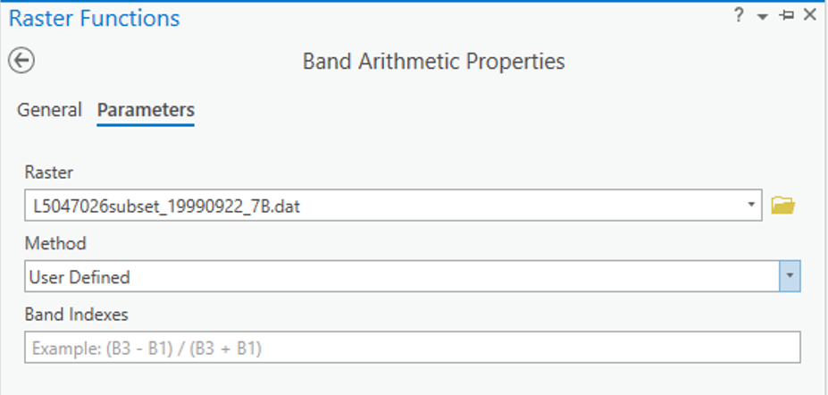 The “Band Arithmetic Properties” dialogue should appear. Under “Raster” use the drop down menu and select the “L5047026subset_19990922_7B.dat” layer. If it is not currently in your map view and can use the folder button and navigate to your lab data folder and select the file. Under “Method” select “User Defined”. It should look like the screen shot below.