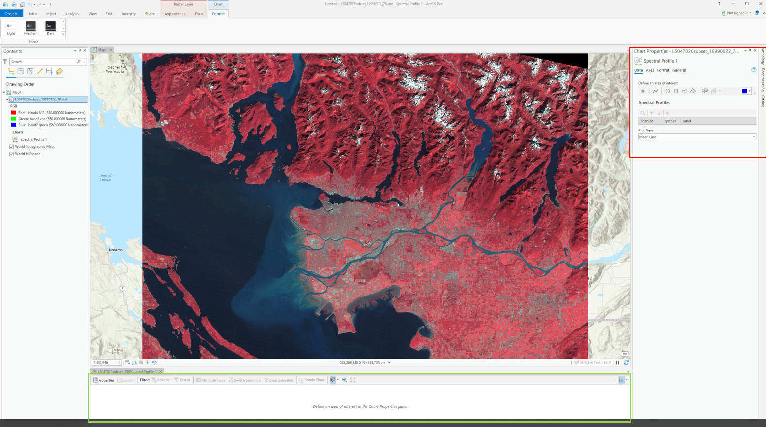 In the Chart properties pane under “Define an Area of Interest” select “point” and then click a pixel on your map. Change the colour and select a variety of different points representing different land cover types (Urban, forest, water, crops, snow).