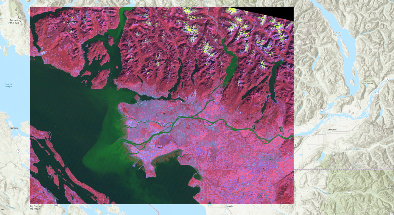 To start the lab, Open a new ArcPro map project and open the the L5047026subset_19990922_7B.dat file into the map window. At this point, you should see an RGB satellite image of the city of Vancouver (Figure 3) if the mapview does not immediately pan to the image right click “L5047026subset_19990922_7B.dat” in the Contents pane and press Zoom to Layer.