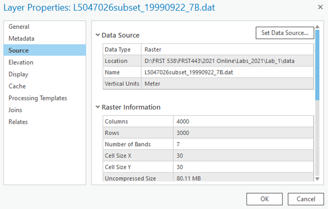 It is now time to explore your imagery. Right click the box beside the “L5047026subset_19990922_7B.dat” file in the Contents pane and select “Properties”. Use the menu on the left-hand side and select the Source page and the Raster Information drop down.